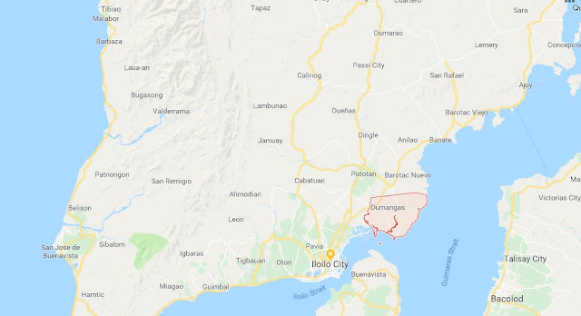 the perimiter of Panay Island to Iloilo (lower center) and Dumangas (pink outline), there to